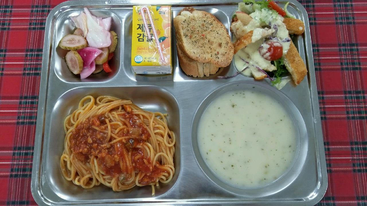 27일 : 미스스파게티, 마늘빵, 브로콜리치즈수프, 치킨케인즈샐러드, 야채아삭피클, 제주감귤쥬스