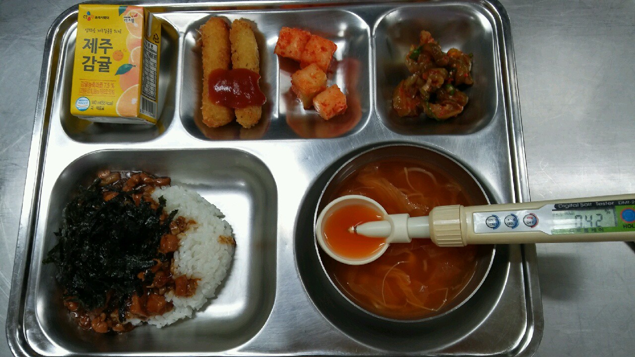 석식 : 찜닭덮밥, 콩나물김치국, 오이장아찌무침, 깍두기, 치즈스틱, 제주감귤쥬스