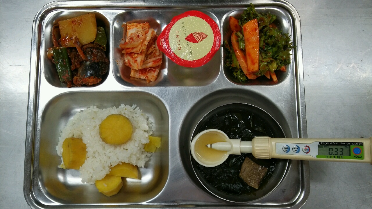 중식 : 고구마밥, 소고기미역국, 꽁치시래기조림, 치커리사과생채, 배추김치, 바닐라아이스크림