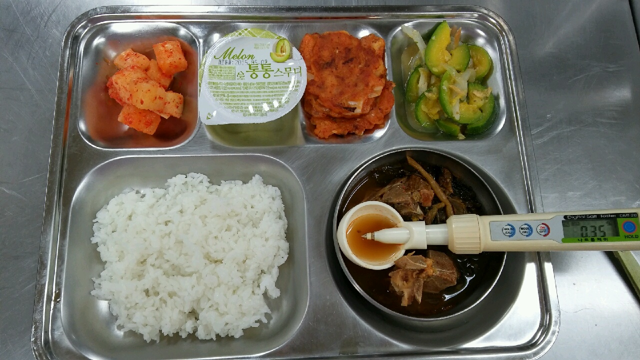메뉴 : 수수밥 호박볶음 오징어김치전 깍두기 등뼈우거지탕 메론통통스무디