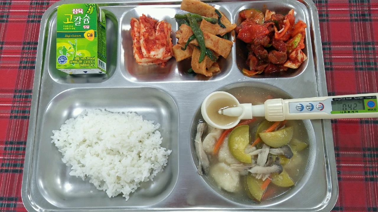 19일 : 현미찹쌀밥, 버섯들깨수제비, 골뱅이사과무침, 어묵꽈리고추볶음, 배추김치, 고칼슘두유