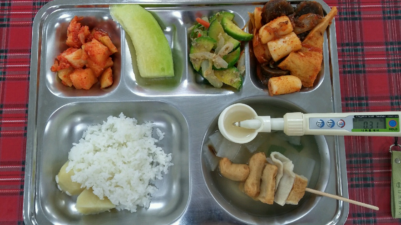 18일 : 감자밥, 꼬치어묵국, 찹쌀순대왕떡볶이, 호박새우젓볶음, 깍두기, 메론