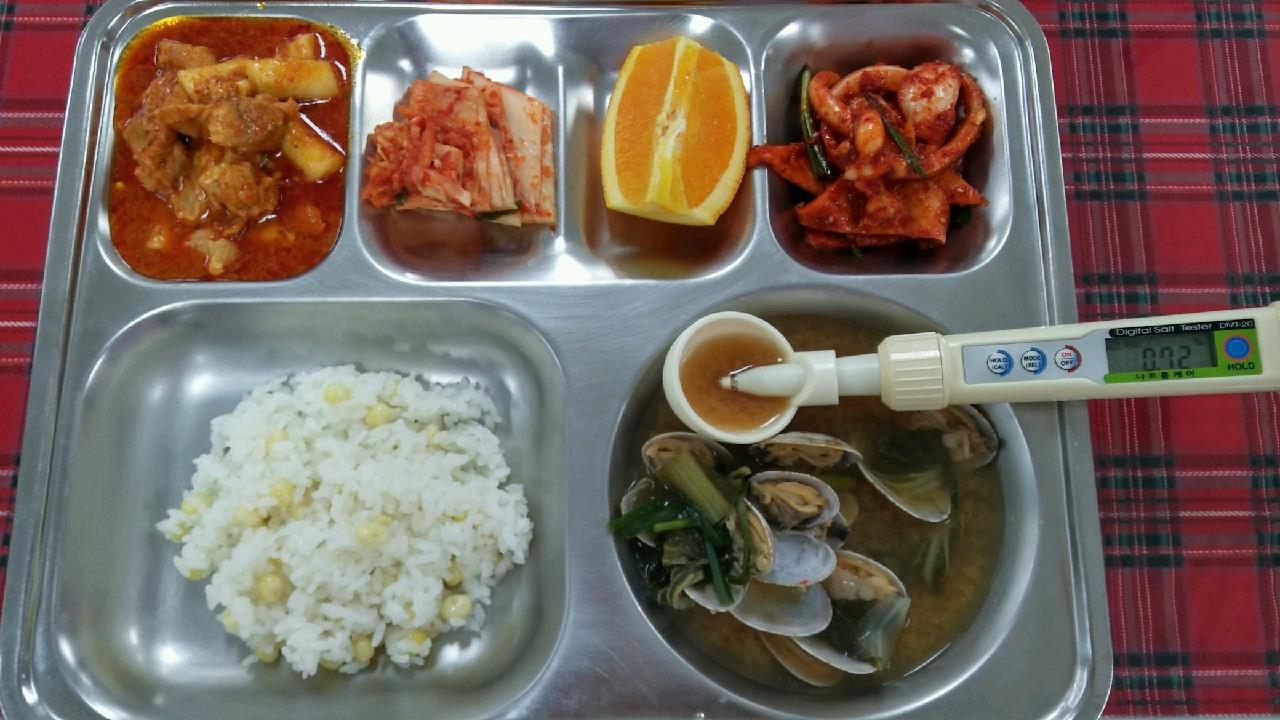 16일 : 옥수수밥, 바지락배추된장국, 치즈불닭, 오묵오징어무침, 배추김치, 오렌지