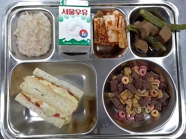 조식: 숭늉, 돈육꽈리고추장조림, 배추김치, 인기가요샌드위치, 시리얼+우유