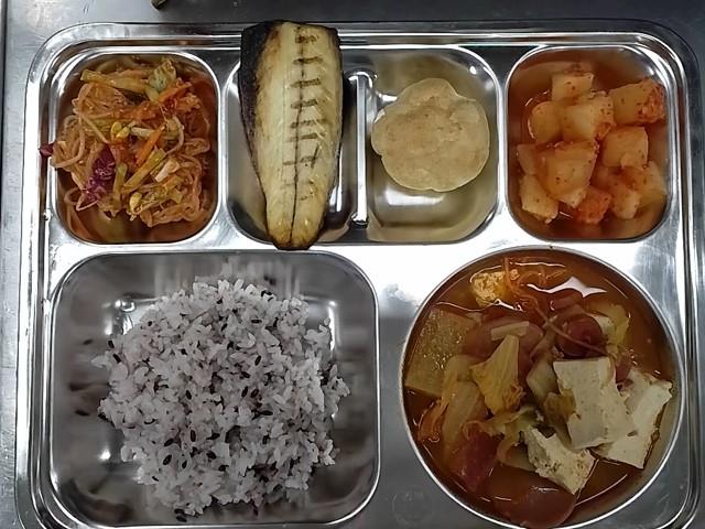 석식: 찰흑미밥, 햄보듬찌개, 쫄면야채무침, 고등어순살구이, 아이스바바리안슈