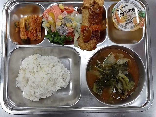 중식: 찰보리밥, 애배추된장국, 치즈돈까스/소스, 배추김치, 양상추콘샐러드/참깨소스, 한라봉감귤주스