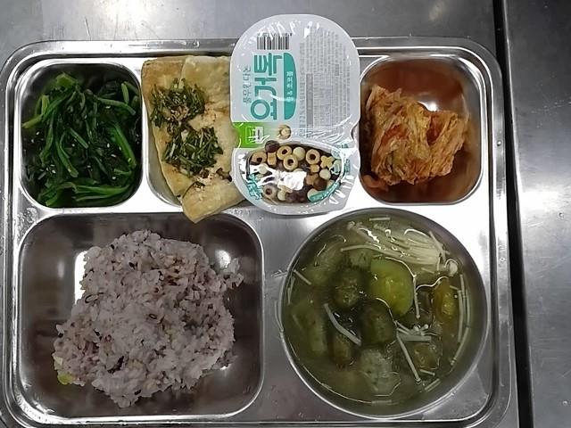 조식: 혼합10곡밥, 소고기삼색옹심이국, 시금치나물, 두부구이/달래양념장, 배추김치,아이러브요거트(한끼오트)