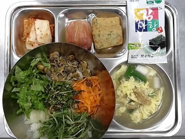 중식: 꼬말돌나물비빔밥+양념장, 북어채계란국, 우리떡명태살두부전, 개별김구이, 배추김치, 친환경사과