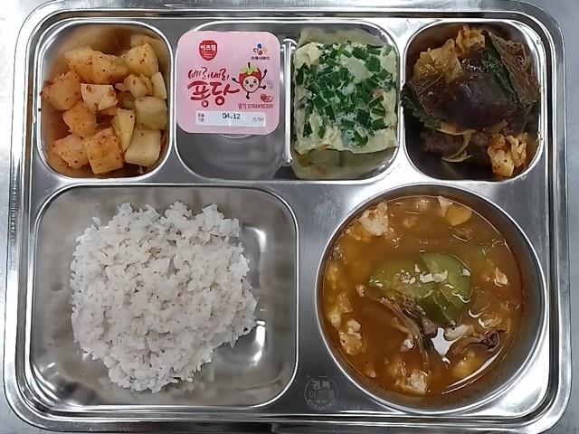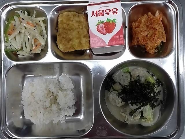 조식: 찰기장밥, 굴림만두국, 감자피망볶음, 순살삼치구이, 배추김치, 딸기우유