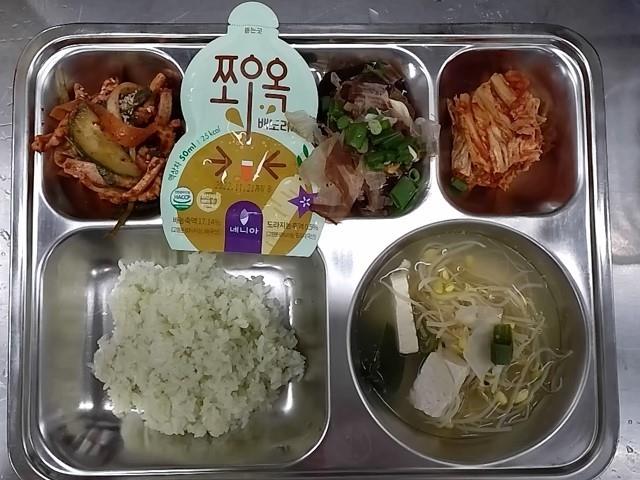 중식: 클로렐라밥, 맑은콩나물국,떡갈비오꼬노미야끼, 배추김치, 배도라지주스