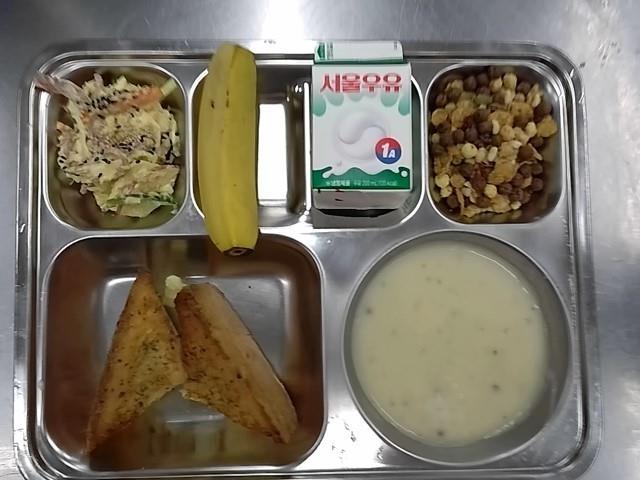 조식:쇠고기크림스프, 맥시칸샐러드, 달달촉촉갈릭브래드, 바나나, 시리얼+우유
