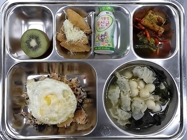 석식: 김치볶음밥, 미역조랑떡국, 미니오이소박이무침, 계란후라이, 치킨너겟+소스, 요쿠르트, 키위