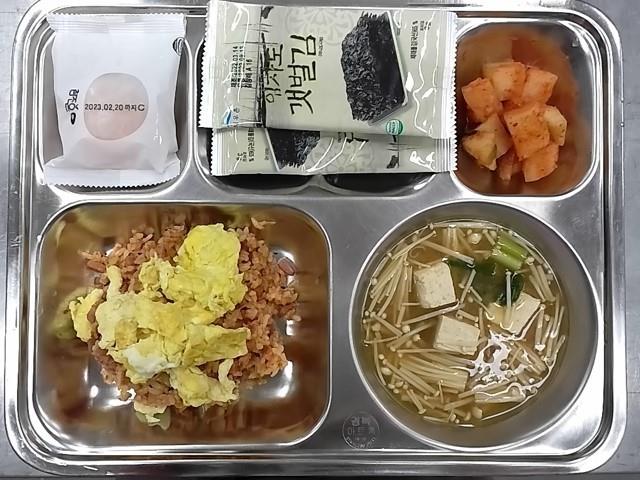 조식: 스팸김치비빔밥, 미소된장국, 김구이(개별), 깍두기, 딸기아이스찰떡