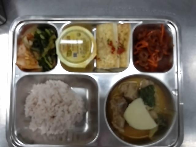 석식: 차수수밥, 돈등뼈감자탕, 매실장아찌, 두부구이양념조림, 배추김치, 애플망고주스