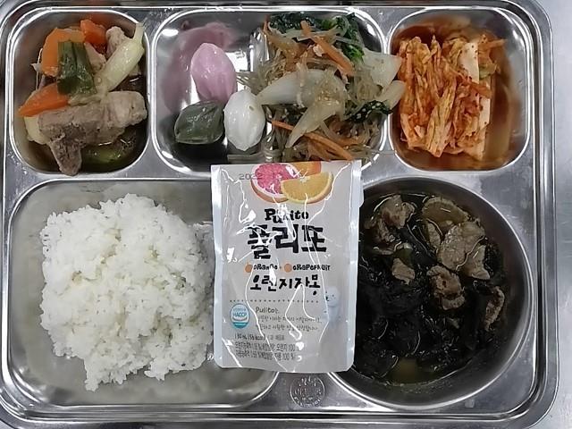 중식: 쌀밥, 한우미역국, 돈갈비찜, 잡채, 배추김치, 꿀떡