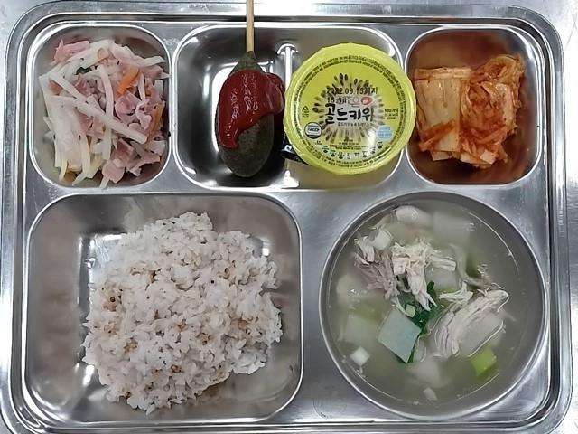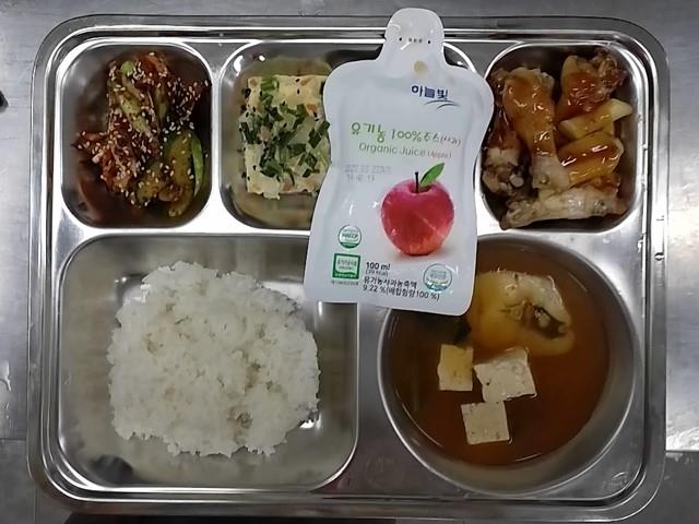 석식: 쌀밥, 동태찌개, 닭봉간장조림, 맛살계란찜, 오이무침, 사과주스