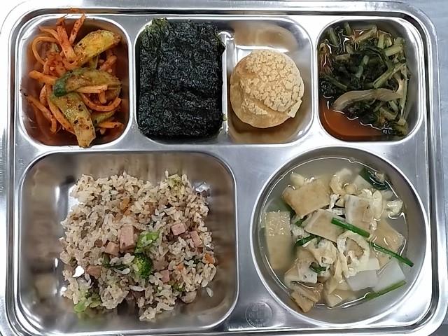 중식: 소고기햄브로콜리볶음밥, 유부어묵국, 도라지무침, 김구이, 열무김치, 비스켓슈