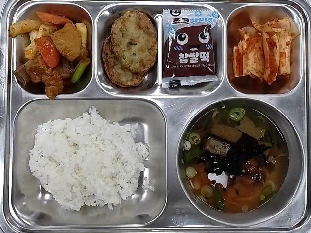 석식: 쌀밥, 도토리묵, 매운돼지갈비찜, 깻잎고기전, 배추김치, 초코생크림찹쌀떡