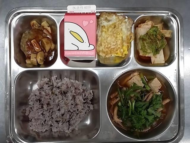 조식: 혼합잡곡밥, 오징어무국, 계란후라이, 고구마함박스테이크/소스, 배추김치,우유