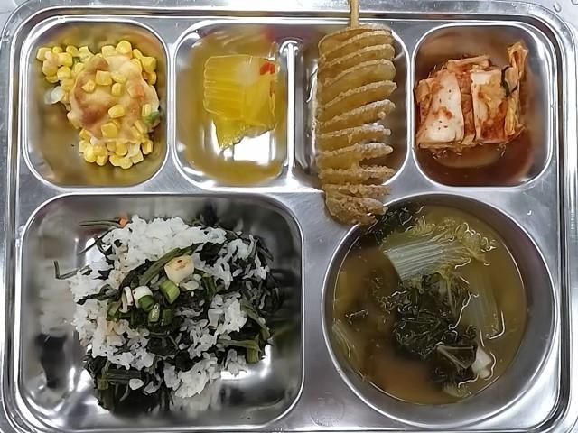 중식: 곤드레나물밥, 애배추된장국, 콘치즈버터구이,배추김치,회오리감자*허니버터맛), 감귤푸딩