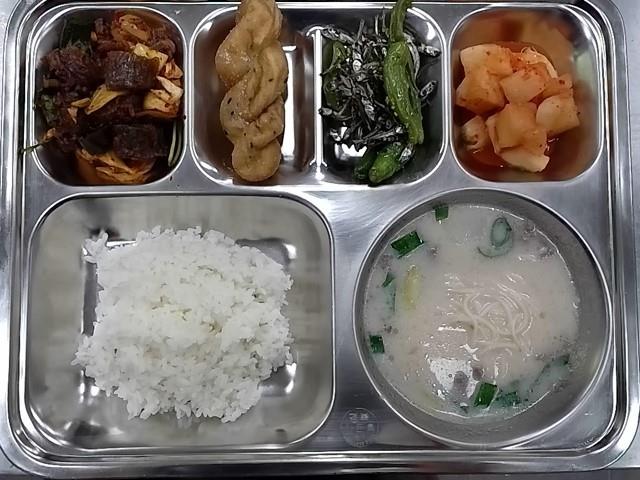 중식: 쌀밥, 설렁탕/소면, 멸치꽈리고추볶음, 순대야채볶음, 깍두기, 흑임자찹쌀꽈배기