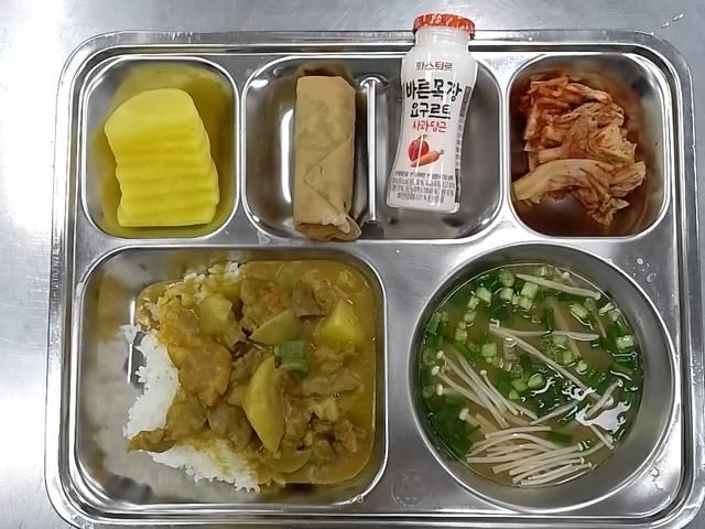 석식: 목살카레라이스, 팽이된장국, 배추김치, 반달단무지, 야채춘권, 사과당근주스