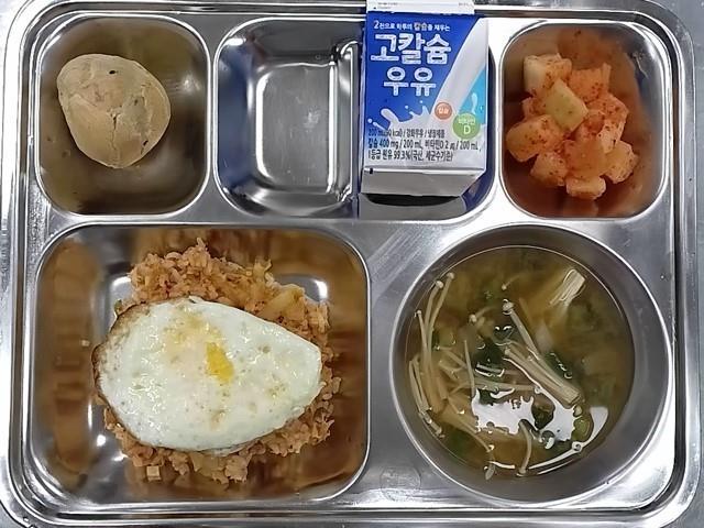조식:참치김치볶음밥, 팽이된장국, 계란후라이, 깨찰빵, 우유