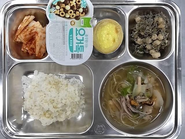 아침: 기장밥, 하얀짬뽕국, 멸치찹쌀콩조림, 배추김치, 에그타르트, 호상요구르트