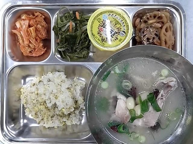 석식: 녹두밥, 닭장각백숙, 연근땅콩조림, 미역줄기볶음, 석박지, 요구르트