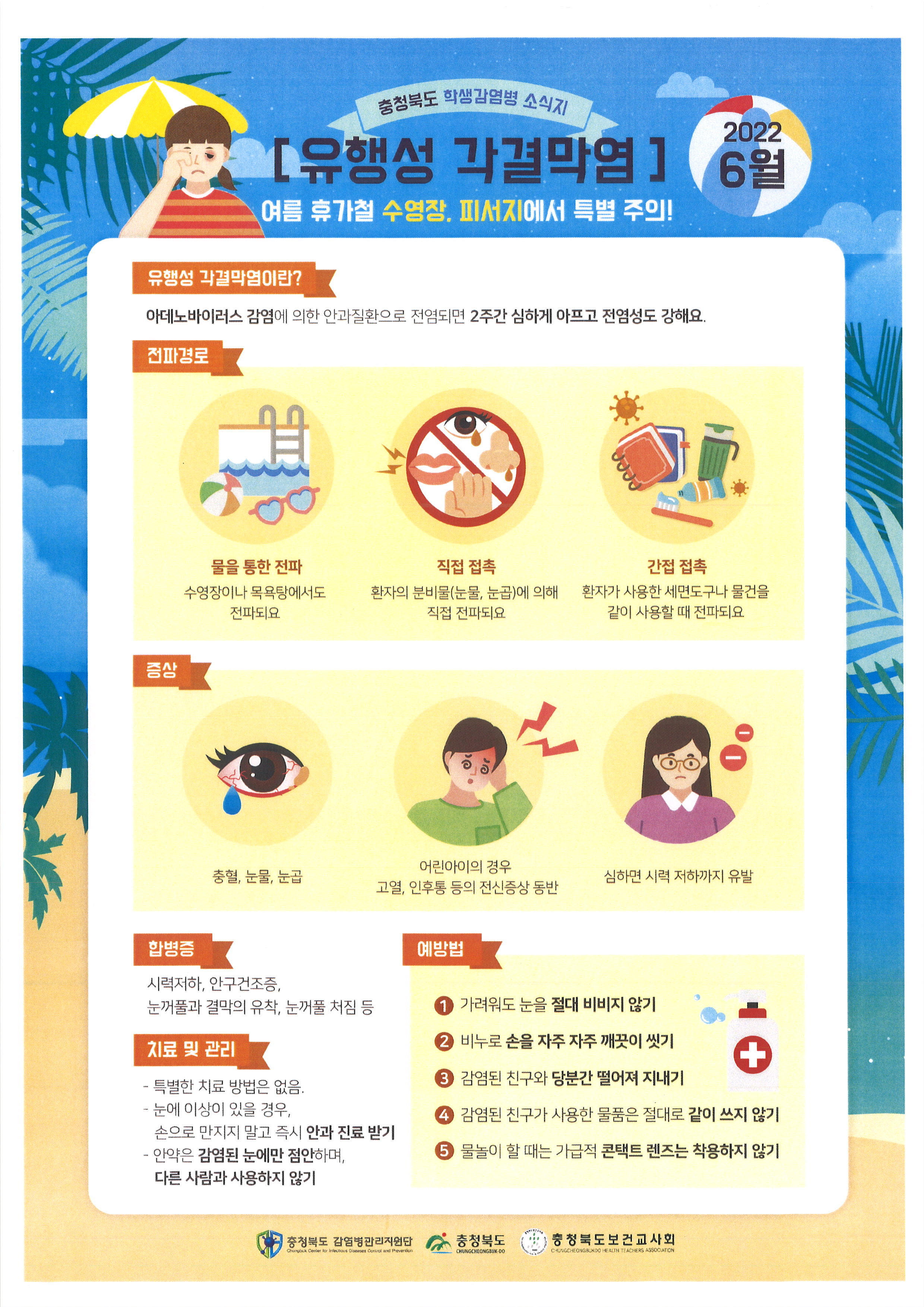 여름철 걸리기 쉬운 유행성 각결막염의 예방 및 관리에 관한 안내입니다. 눈에 이상이 있을 경우 손으로 비비지 말고 바로 안과진료를 받아볼 수 있도록 가정내에서도 건강관리에 힘써주시기 바랍니다.