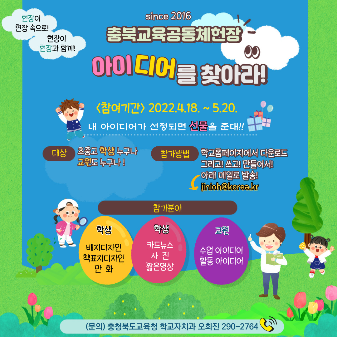 학교공돛에 인권 보호 및 존중과 배려의 인권친화적인 학교문화 조성을 위하여 교육과정과 연계한 충북교육공동체현장 실천, 홍보 아이디어를 공모합니다.