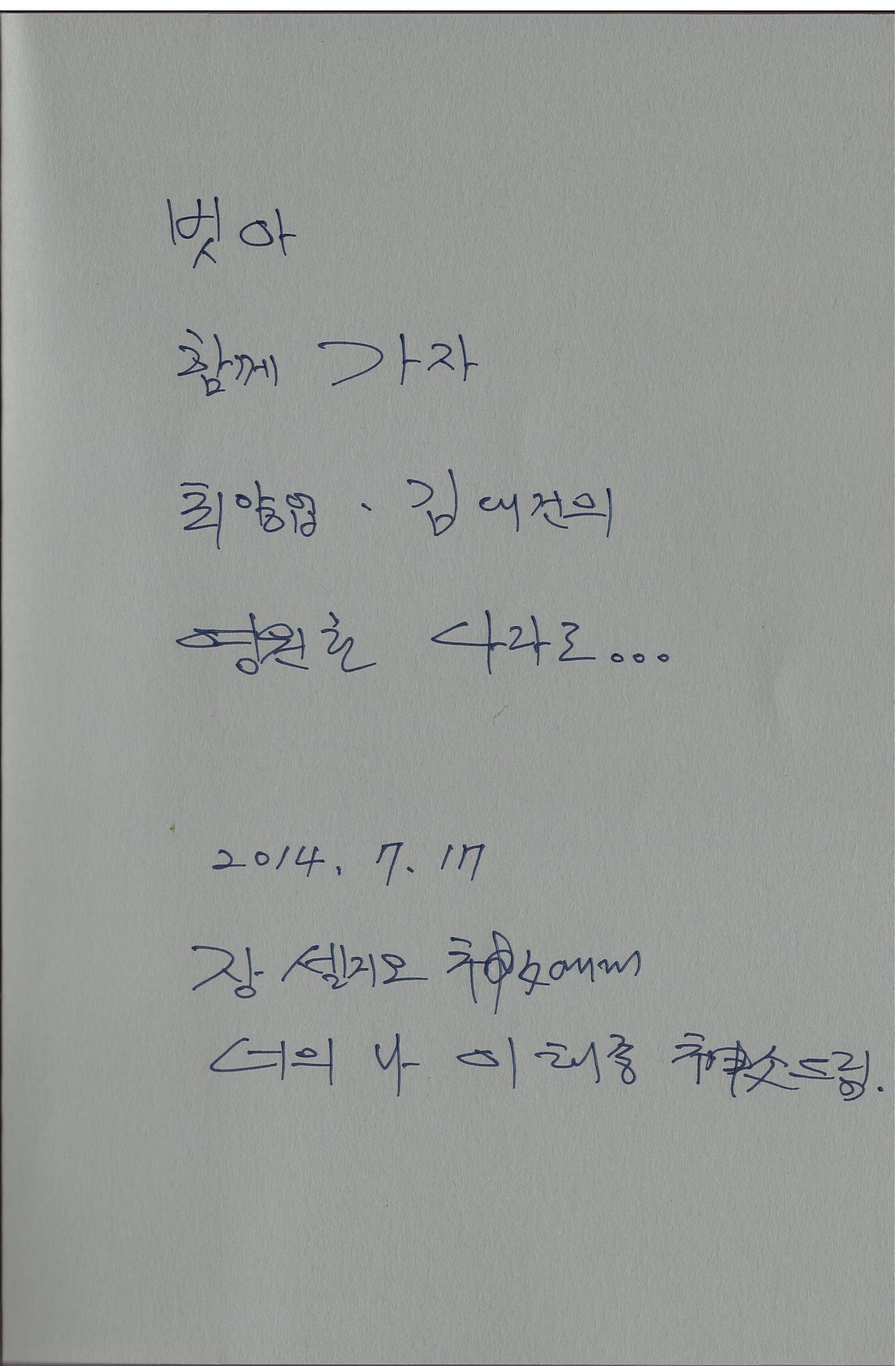이태종 신부님으로부터 교장 신부님이 받으신 저자 친필 서명과 메시지를 함께 첨부합니다.