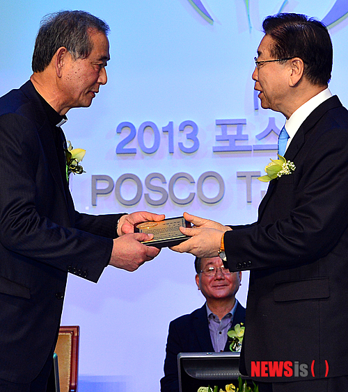 【서울=뉴시스】조종원 기자 = 27일 오후 서울 강남구 대치동 포스코센터에서 열린 2013 포스코청암상 시상식에서 정준양 회장이 윤병훈 양업고등학교 초대 교장에게 청암교육상을 전달하고 있다.