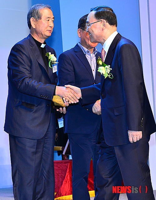 【서울=뉴시스】조종원 기자 = 정홍원 국무총리가 27일 오후 서울 강남구 대치동 포스코센터에서 열린 2013 포스코청암상 시상식에서 청암교육상을 수상한 윤병훈 양업고등학교 초대 교장과 인사를 나누고 있다.