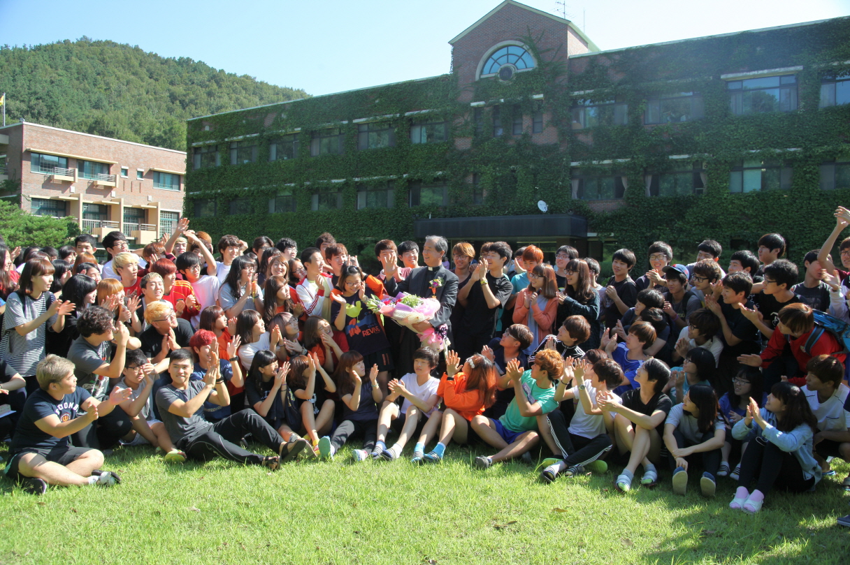 전교생이 1교시 쉬는 시간에 잔디구장에서 기념촬영과 축하의 박수를 보내드렸습니다.