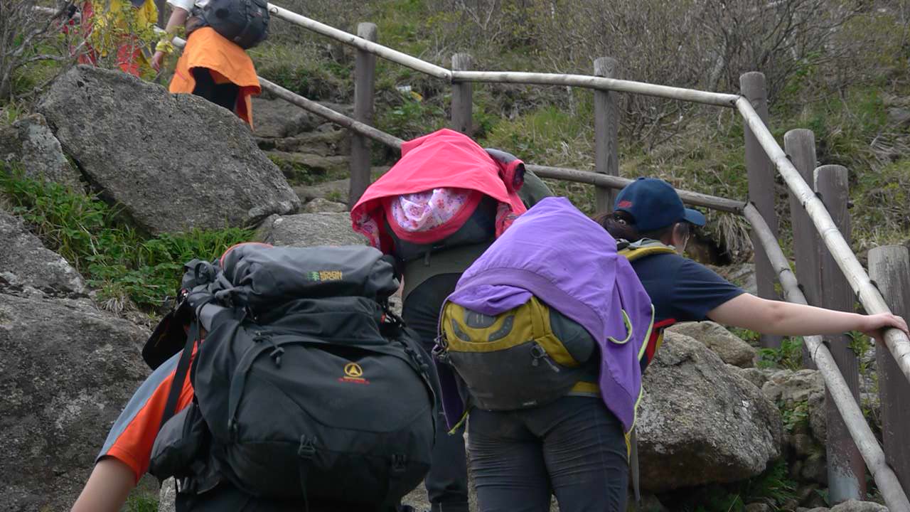 남학생들은 베낭을 2개씩 지고 올라갔다.