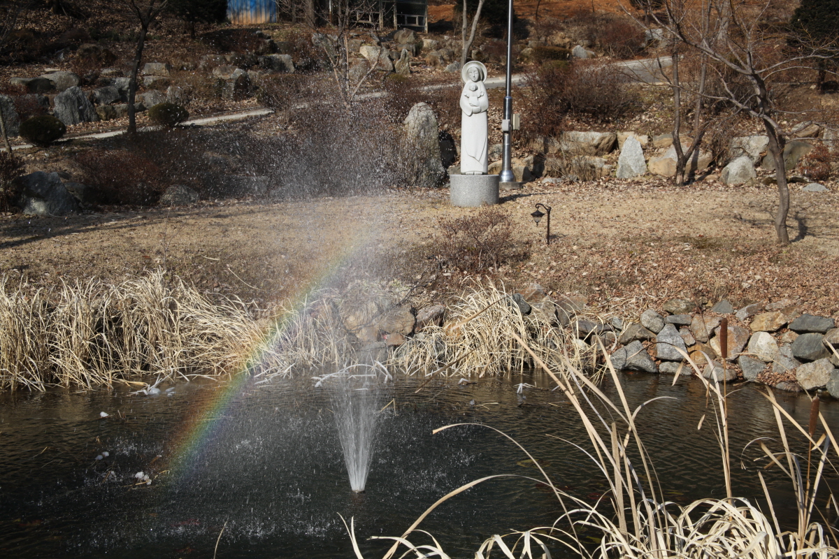 2012년 새해 설날 아침에 연못에 나갔더니 분수 주변에 작은 무지개가 아름답게 구름다리를 만들어 놓았더군요~