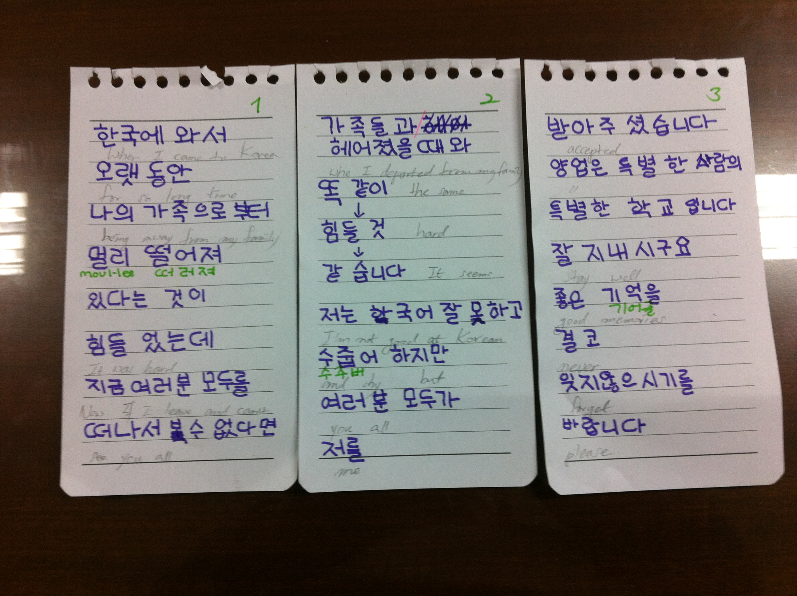 한국에 와서 오랫동안 나의 가족으로부터 멀리 떨어져 있어서 많이 힘들었습니다. 그런데 지금은 여러분 모두를 떠나 친구들을 볼 수 없다고 생각하니, 가족들과 헤어졌을 때와 똑같이 힘들 것 같습니다.