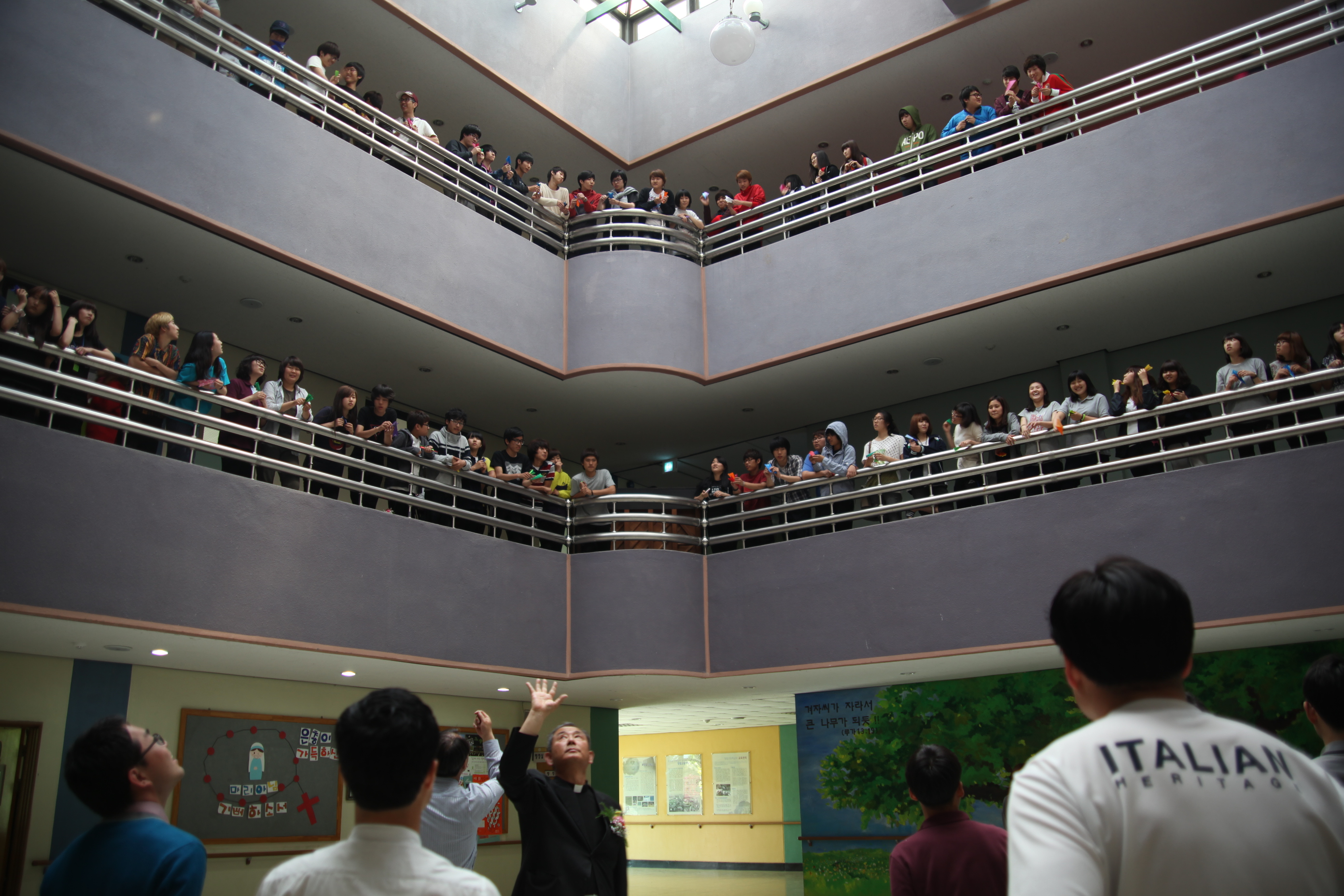 상장 수여식이 끝난후 학생들은 중앙홀의 2,3층의 난간으로 일제히 올라가더니 그곳에서 사랑의 종이 비행기를 쌤들을 향하여 날렸지요. 밑에 있던 쌤들은 그중에 하나의 종이 비행기를 집어서 이름이 적힌 학생들에게 방금전 부상으로 받았던 쵸콜렛을 도로 학생들에게 던져 주라고 그러네요~ ㅠㅠ
