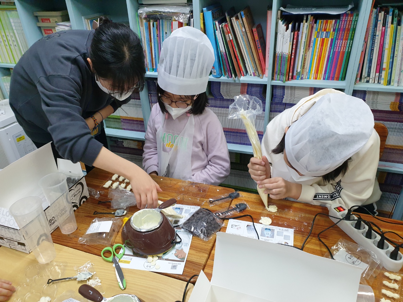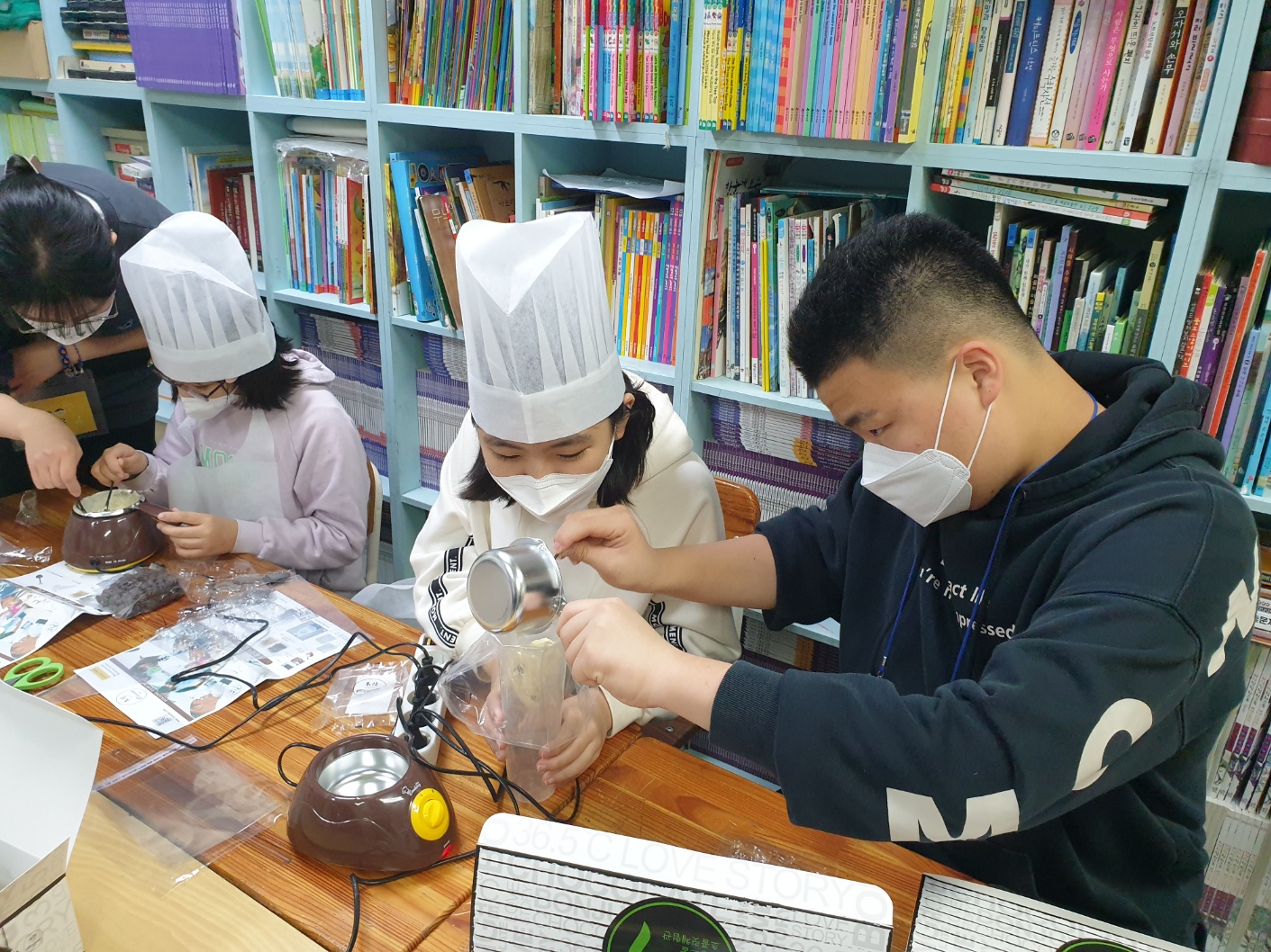 멜팅기로 초콜릿을 녹여 맛있는 초콜릿을 함께 만들었습니다.