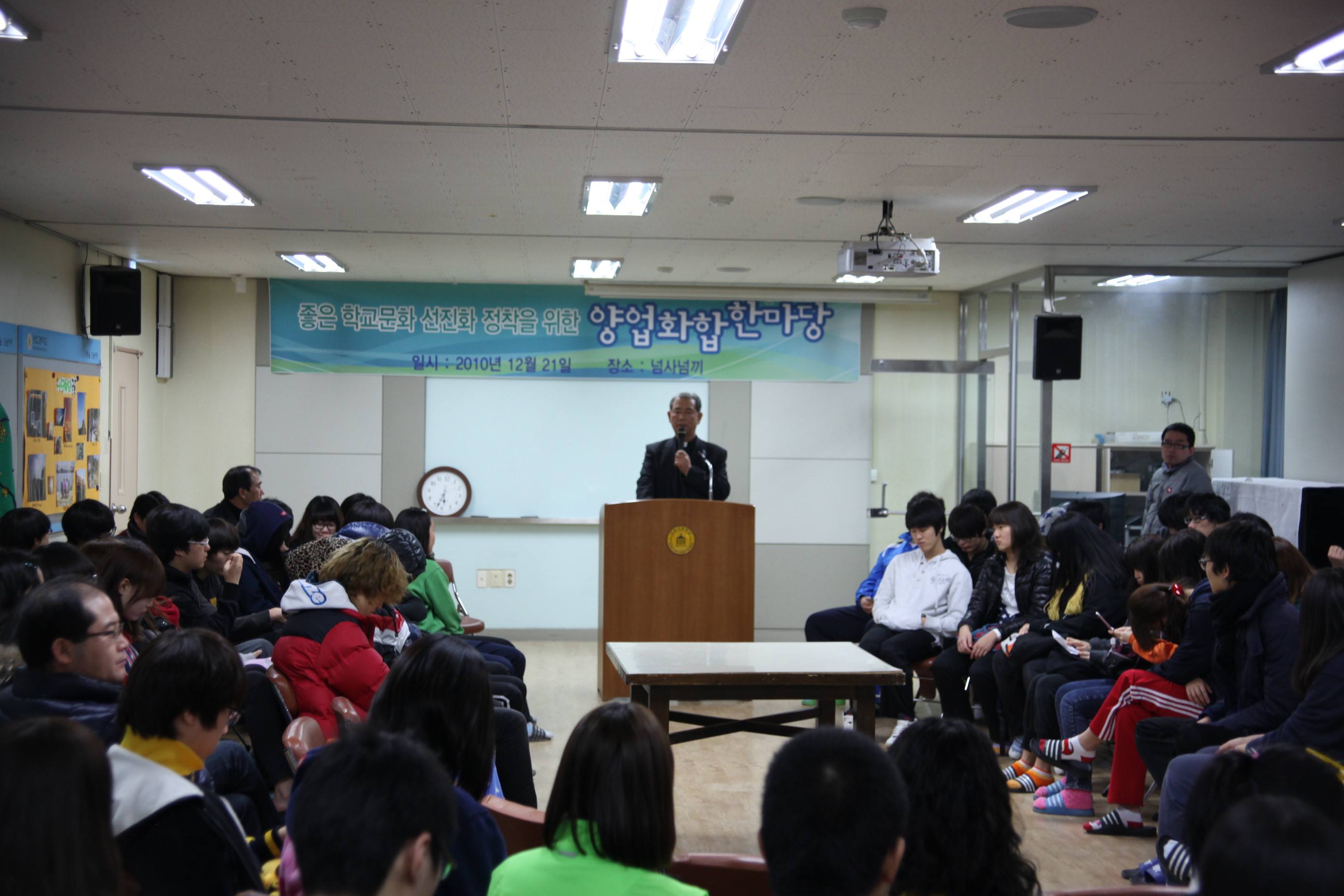 "양업화합 한마당"을 위해서 각 학년마다 학생들의 공동체 생활에 있어서 고민스러웠던 점에 대하여 나누었으며 이를 잘 정리하여 각 학년의 부장 선생님 3분이 전교생들 앞에서 고쳐야 할 점들과 아쉬웠던 점들에 관하여 모두 말씀 하셨습니다.