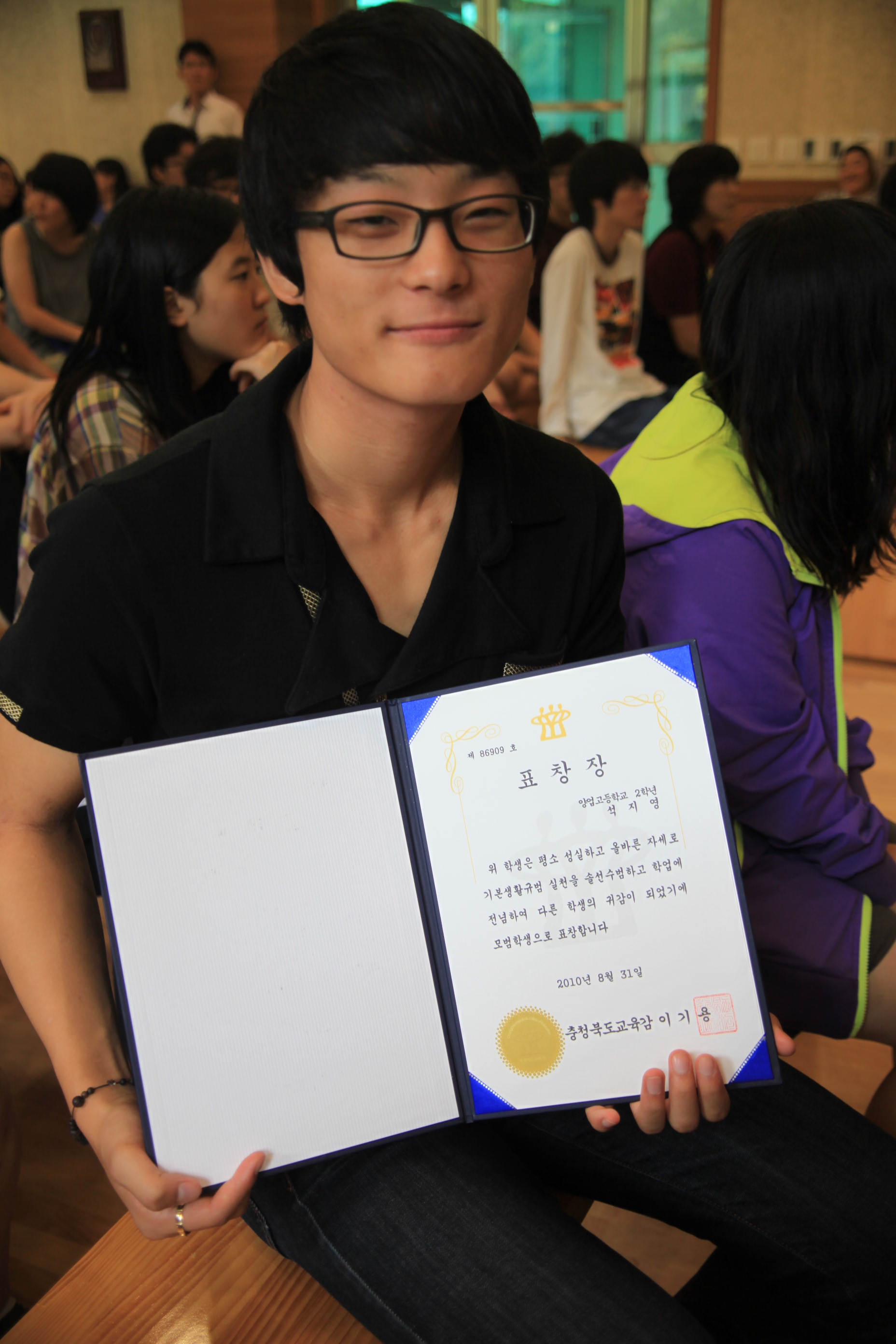 2학년에 재학중인 석지영 학생이 충청북도 이기용 교육감이 하사하는 모범상을 받았습니다.