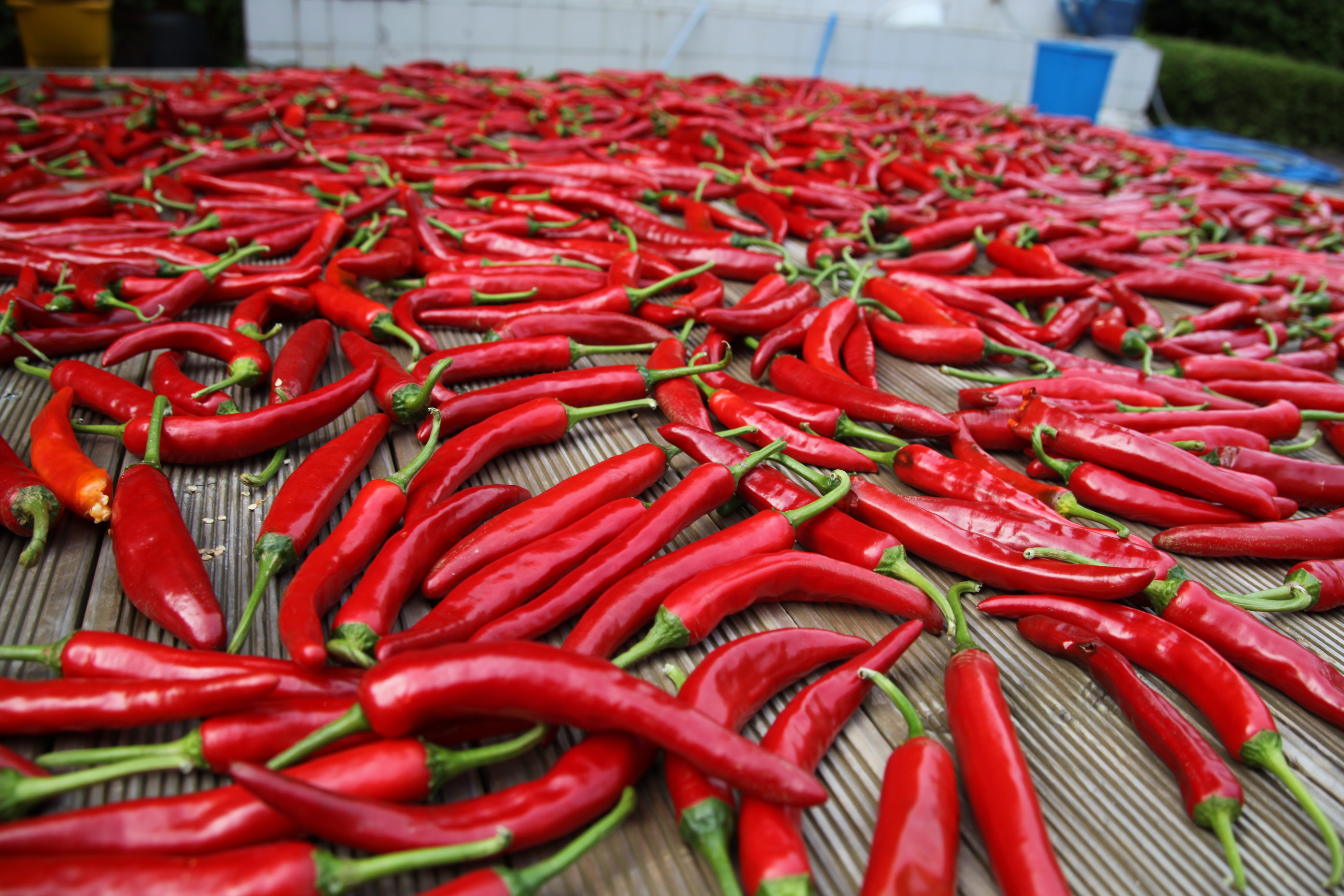 1,2학년 학생들이 노작시간에 키운 고추를 평상에 말리고 있는 중입니다.