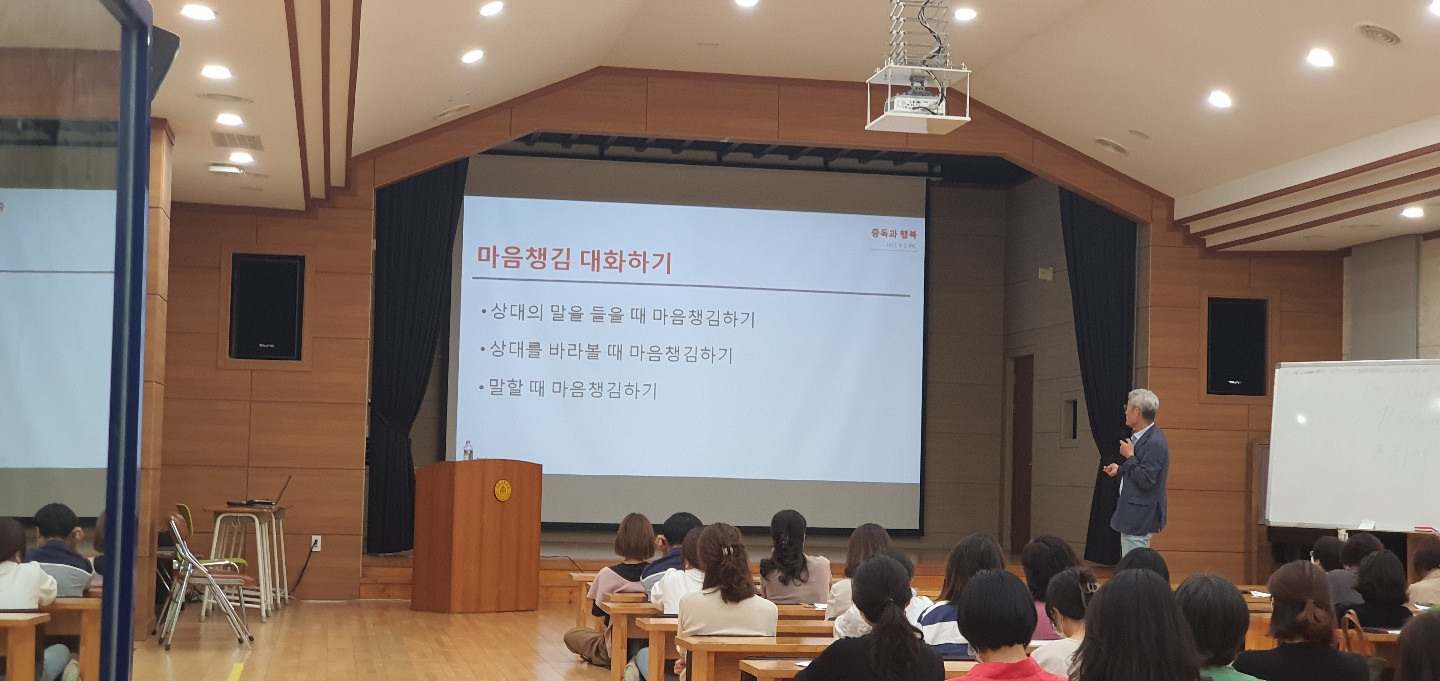 2학기 첫 번째 학부모 교육으로 “중독과 행복”이라는 주제로 가톨릭 꽃동네 대학교 박상규 명예교수님의 특강과 1, 2학년 네팔 이동수업 일정 및 준비물 안내가 있었습니다.