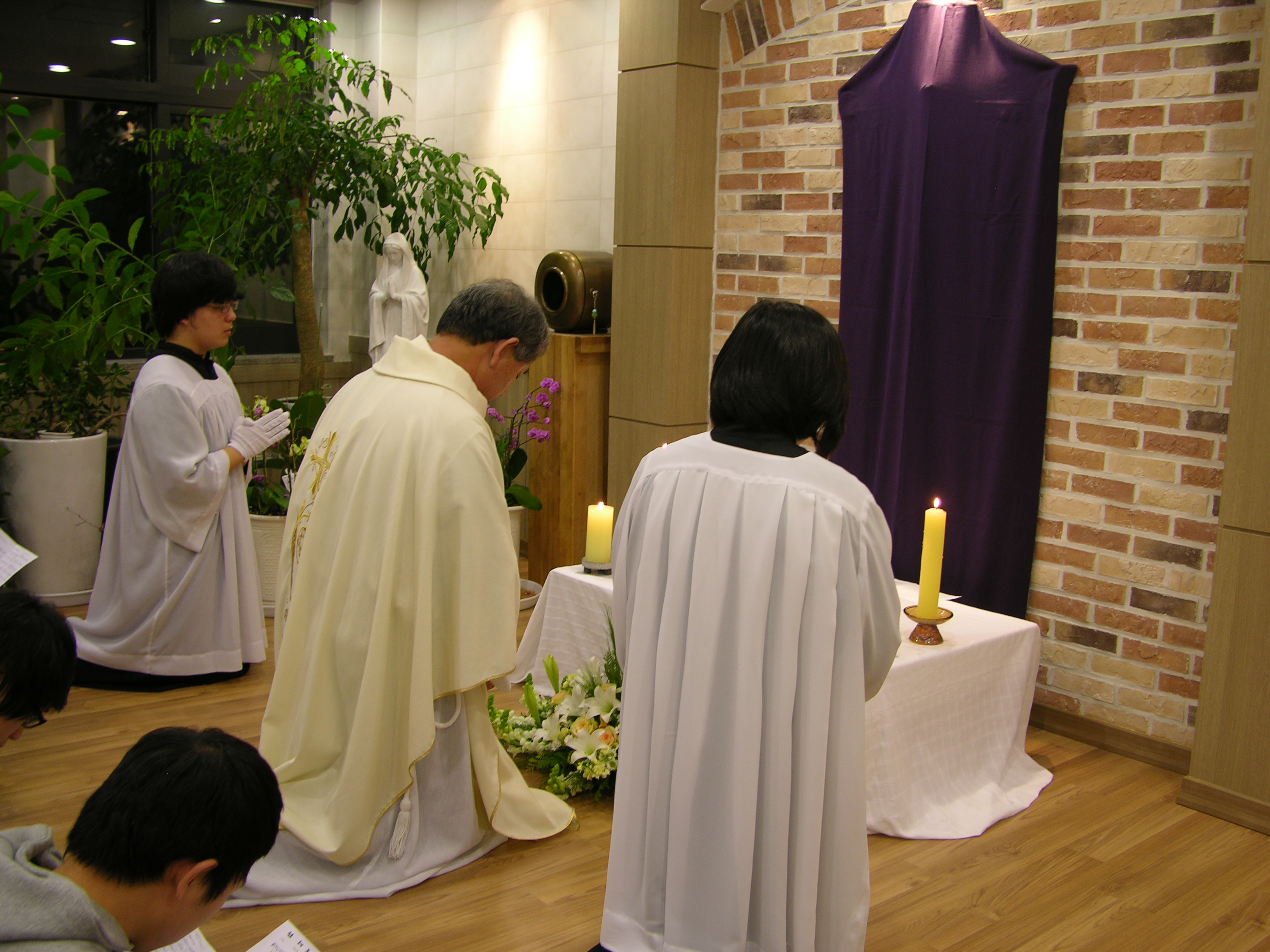 주의 만찬 미사가 끝난후에 소성당으로 자리를 옮겨서 성체조배가 이어졌는데 3학년, 2학년, 1학년 순으로 한시간씩 수난당하시기전 고뇌하시는 예수님의 곁에서 머물렀습니다.