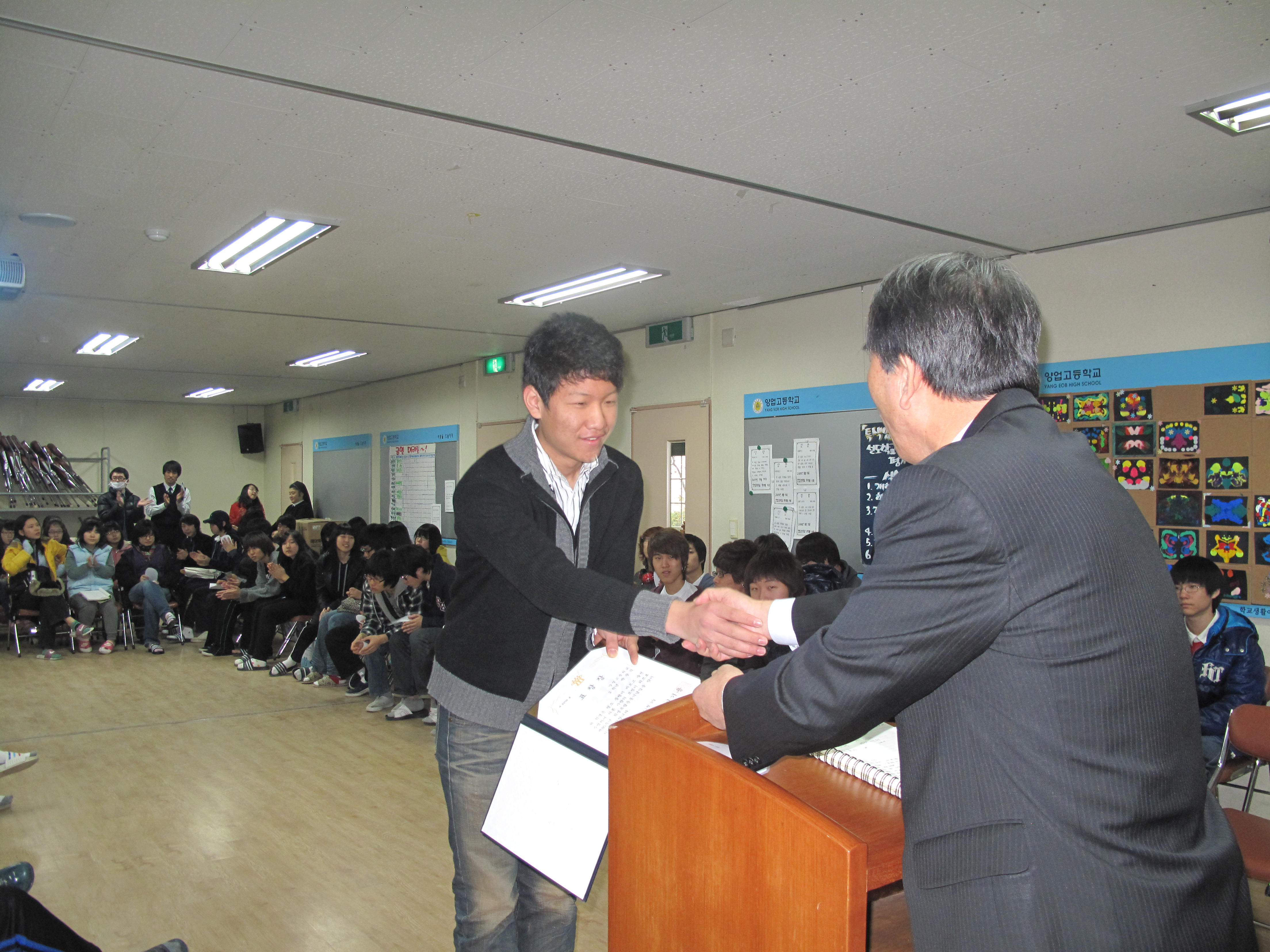 오늘 전체회의 시간에 양업고 학생회장인 박광식 학생이 충청북도 교육감이 수여하는 모범학생 표창상을 받았습니다.