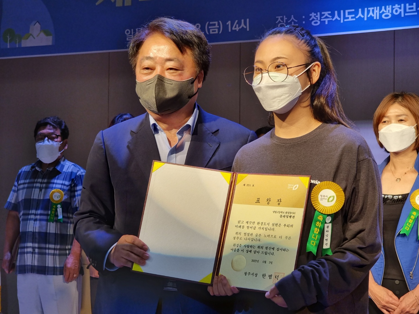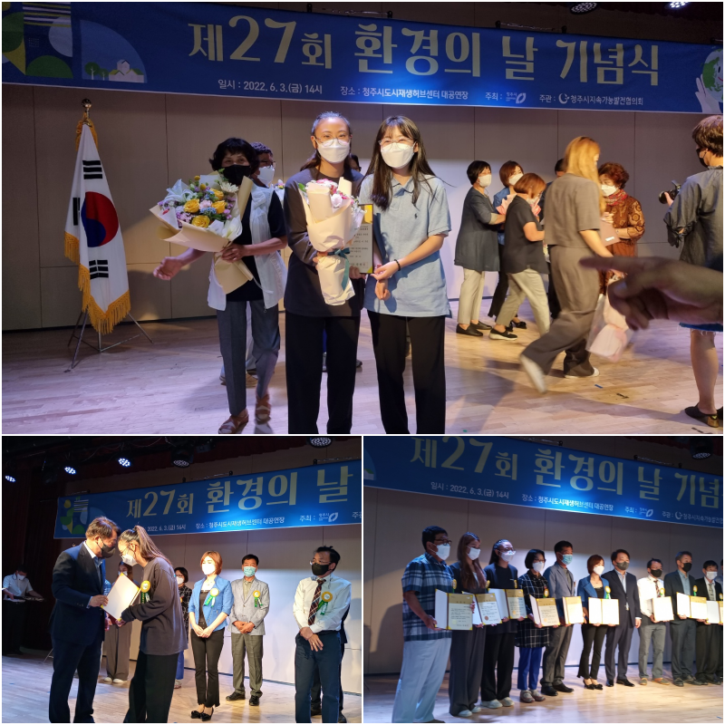 2022.06.03.(금) 청주시 도시재생허브센터에서 실시된 제27회 환경의 날 기념식에서 본교 플라잉펭귄 동아리가 환경보호 유공자 시장 표창을 받았습니다.