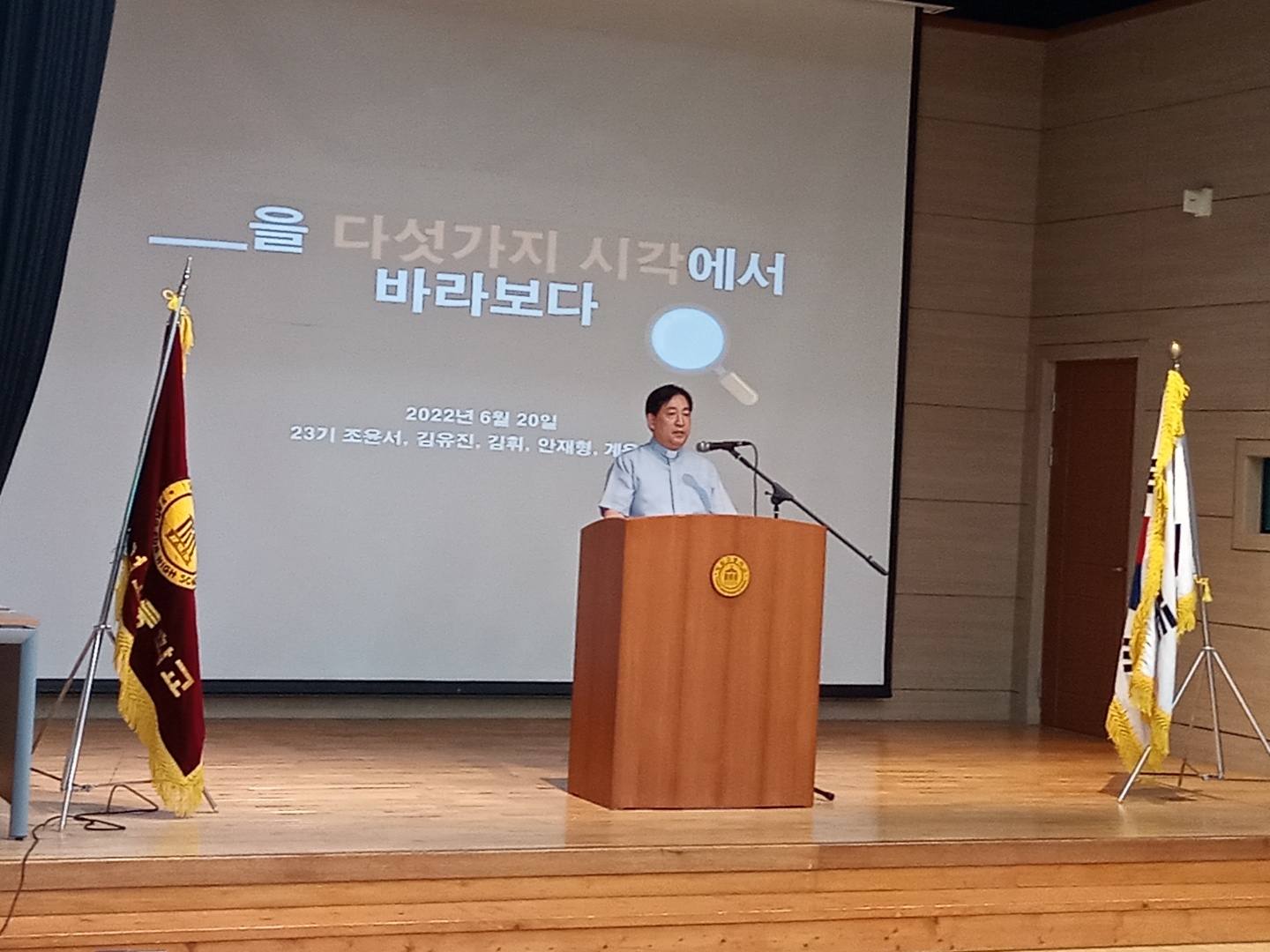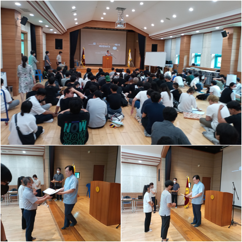 2022.06.20.(월) 학교장 신부님과 학생 및 교직원이 한자리에 모여 전체훈화 시간을 가졌습니다.
