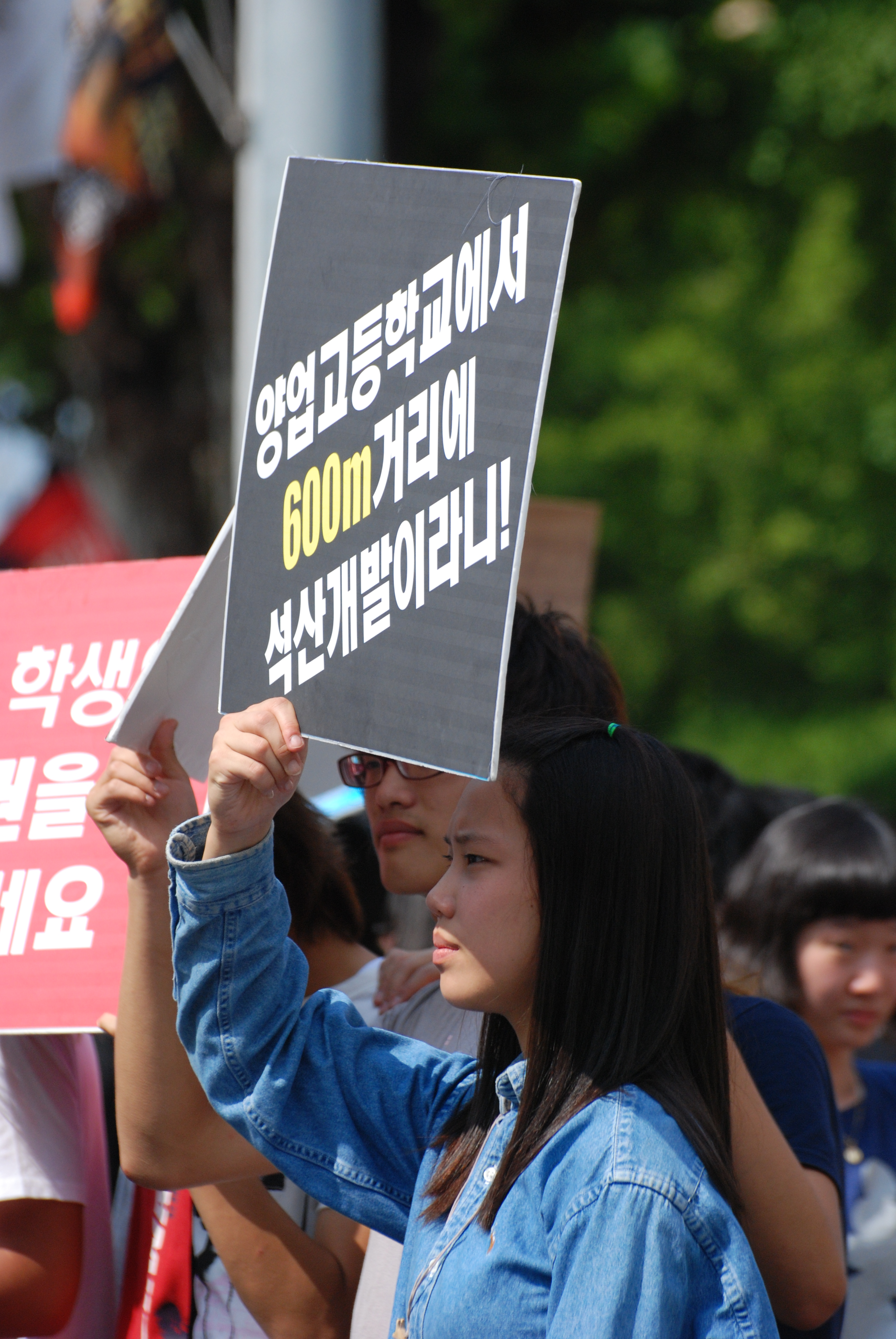 학교를 지키고 싶은 간절한 마음과 더 좋은 환경에서 공부하고 웃고 뛰놀 수 있는 학생의 당연한 권리를 되찾기 위해 저희는 지난 6월 13일 청원군청 앞에서 궐기대회를 열었습니다. 더운 날씨였지만 침해받는 학습 권과 생존권을 되찾기 위해서 목소리를 높여가며 외쳤고, 거리에 나가 직접 서명운동을 하기도 했습니다. 저희가 학습 권 까지 포기하고 거리로 나와 외치면 군청에서는 학생들의 목소리에 귀를 기울여 줄 거라고 생각했고, 저희의 노력으로 학교를 지킬 수 있을 거라는 믿음을 가지고 있었기에 자진해서 군청을 찾아갔습니다. 그럼에도 군청 문은 굳게 닫혀있었고 심지어는 민원실의 문까지 닫아버리고는 저희의 호소를 들은 체도 하지 않았습니다. 사실 저는 이 일이 있기 전까지는 석산개발이 무엇인지조차 몰랐습니다. 하지만 살갗으로 느껴지는 석산개발의 폐해로 저희 학생들은 조그마한 힘이라도 보태고자 시험이 끝나자마자 3일 동안 밤을 새워가며 UCC를 제작하였습니다. 하지만 이러한 노력도 개발을 취소하게 만들지는 못했습니다. 저희들의 소리가 너무 작았던가요? 아니면 어른들의 욕심이 너무 과했던가요.