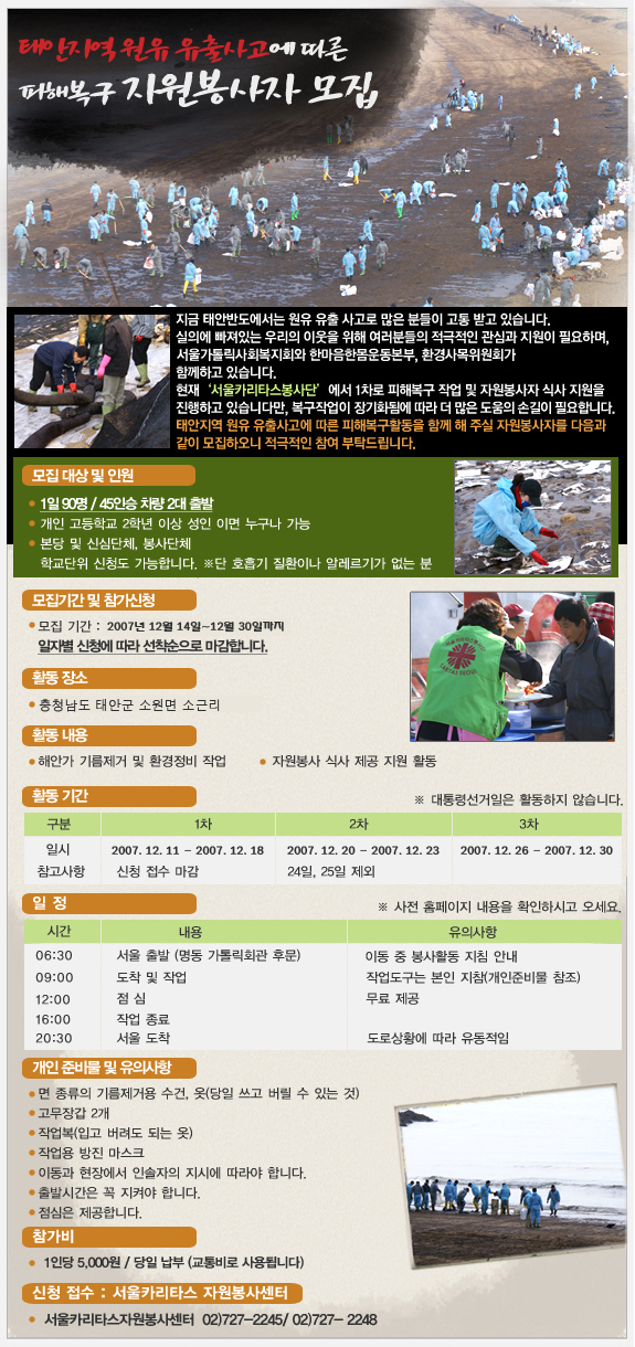 서울 가톨릭 까리따스가 주최하는 태안반도의 자원 봉사자들을 모집하고 있답니다.